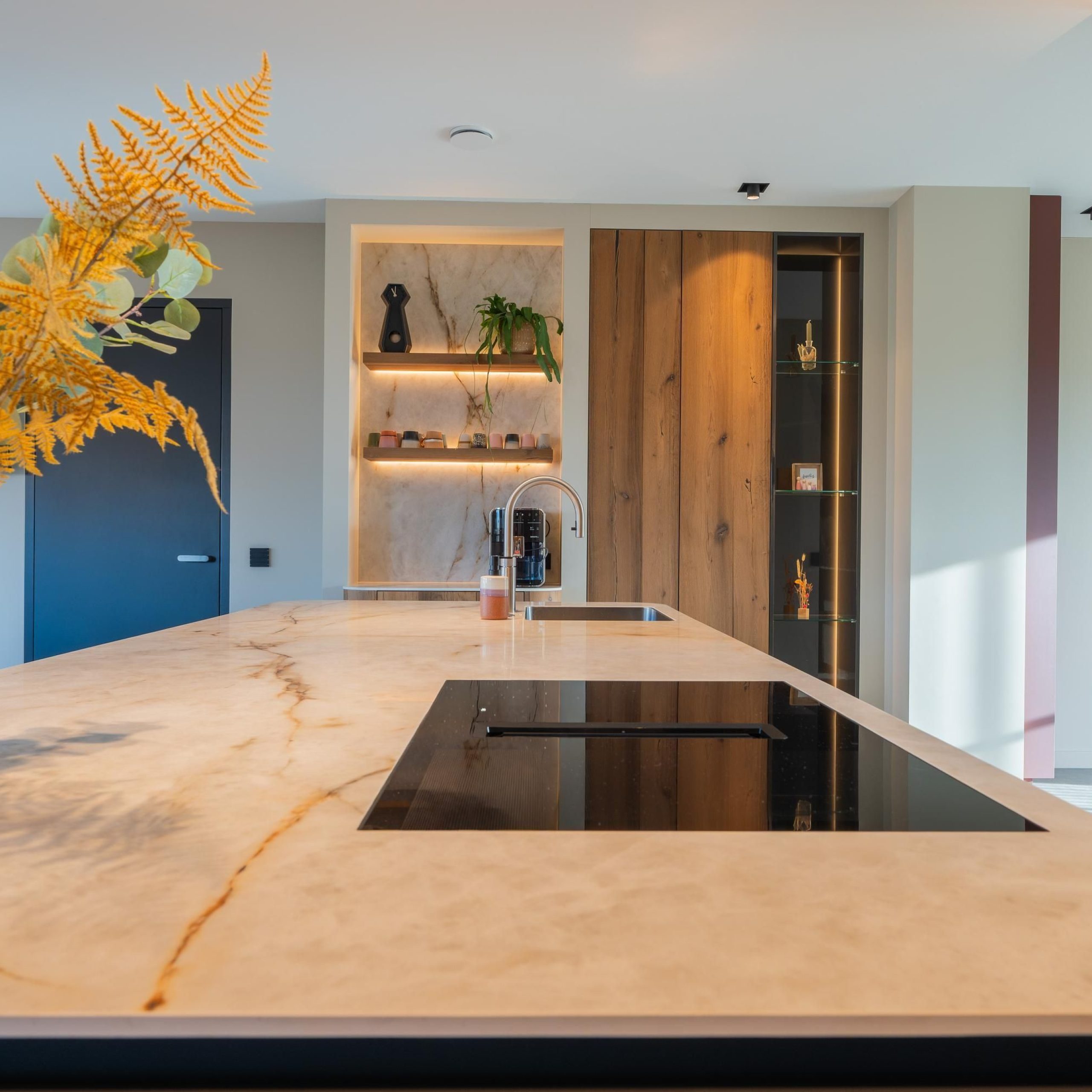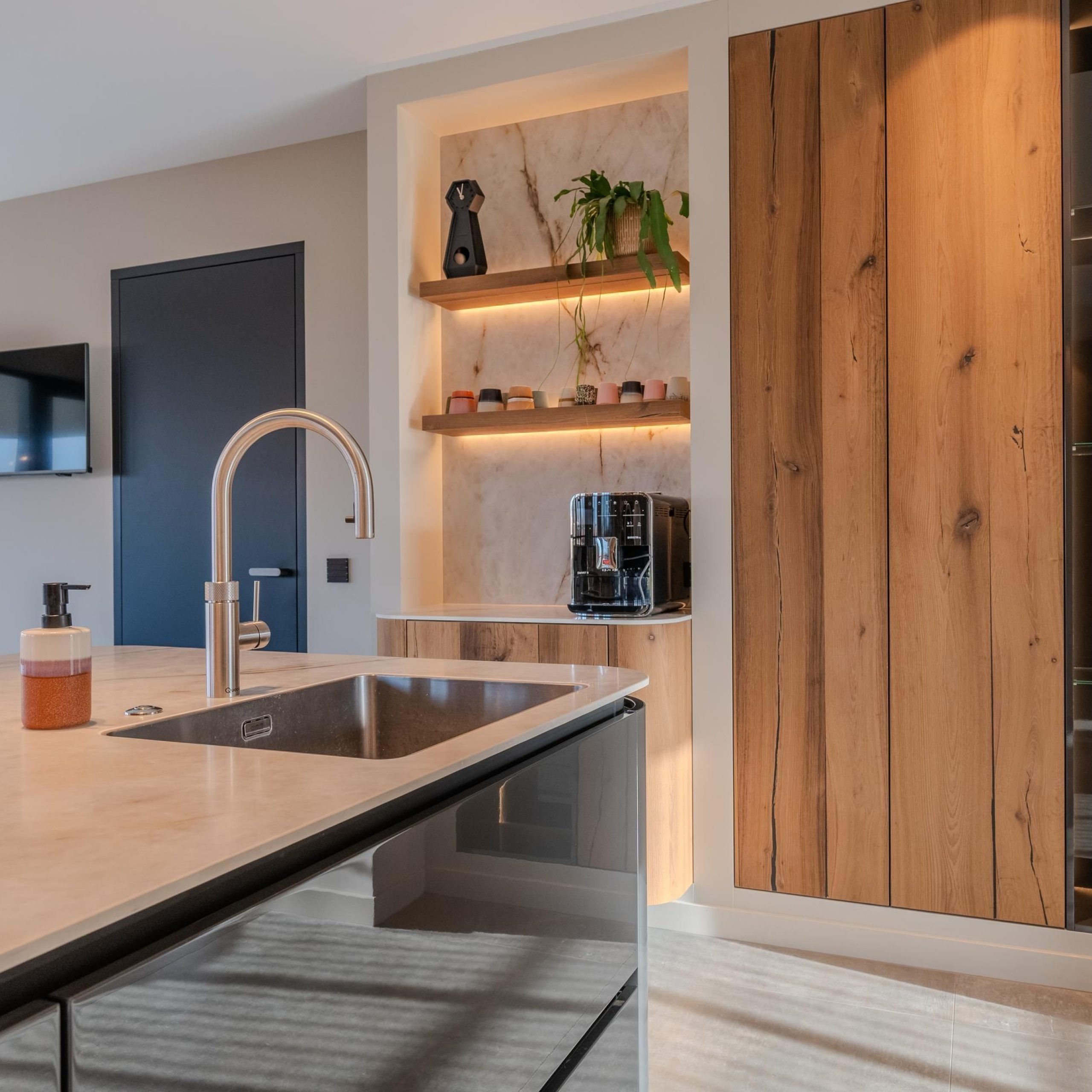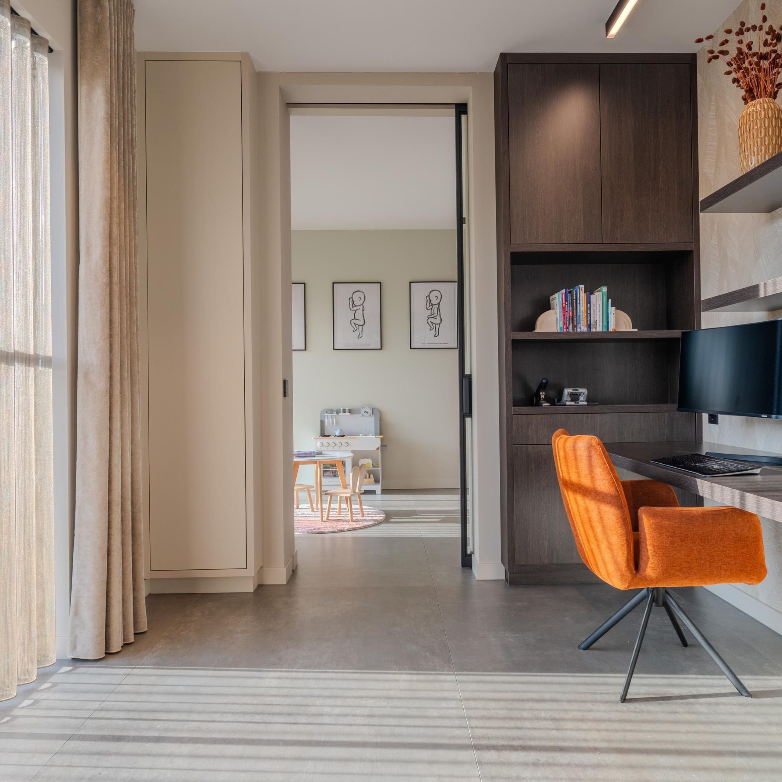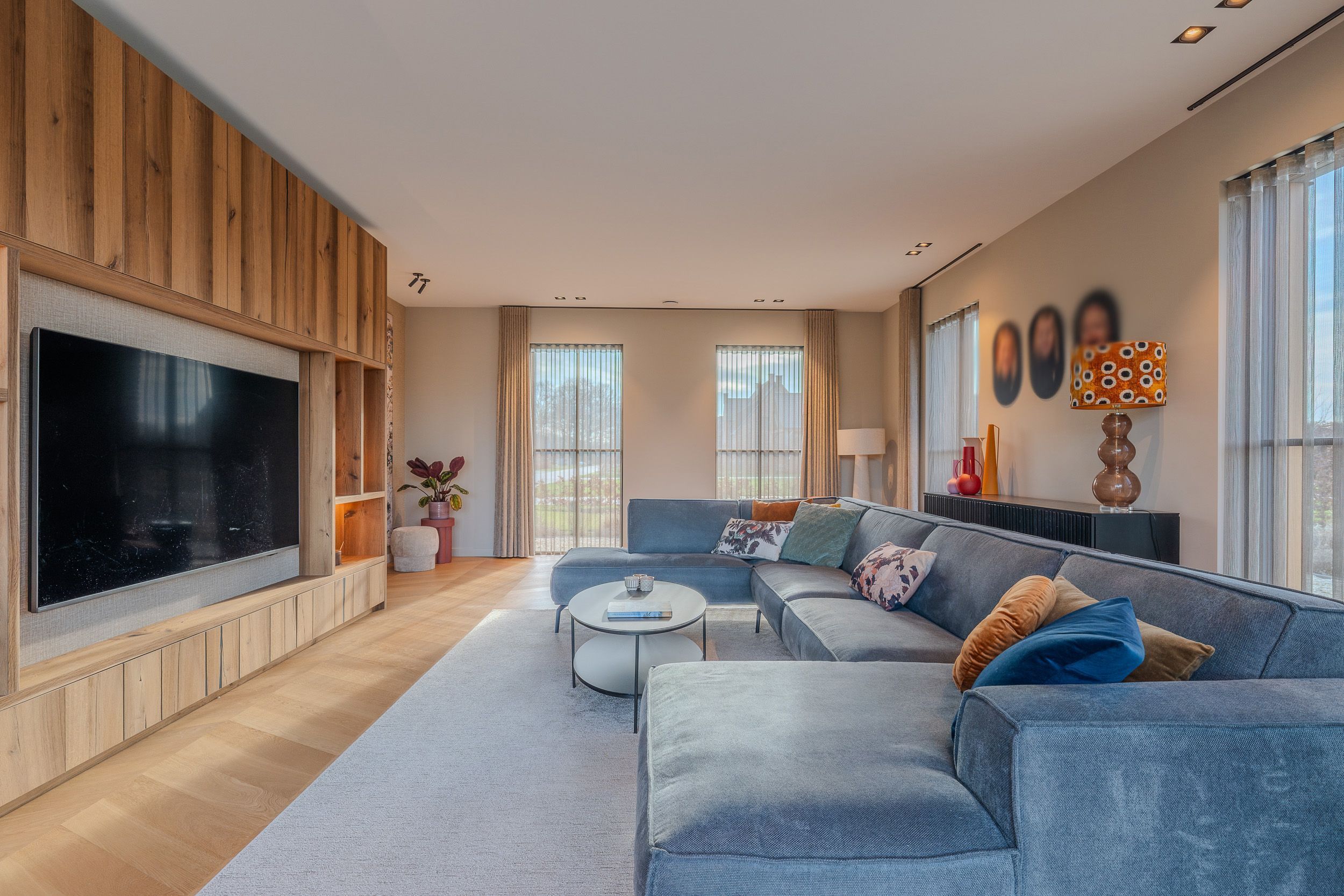 De kracht van dit project zit in de balans tussen rust en karakter. Warme houttinten worden gecombineerd met strakke lijnen, zachte kleuren en uitgesproken accenten. Denk aan het maatwerk in de keuken, de geïntegreerde kastenwanden en de verfijnde afwerking in de badkamer.